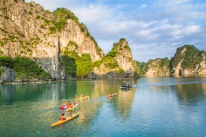 Kayaking dans la région. Retour à la jonque. Check-out (cabine). Navigation au travers des iles Cho Da et l’île Ga Choi.